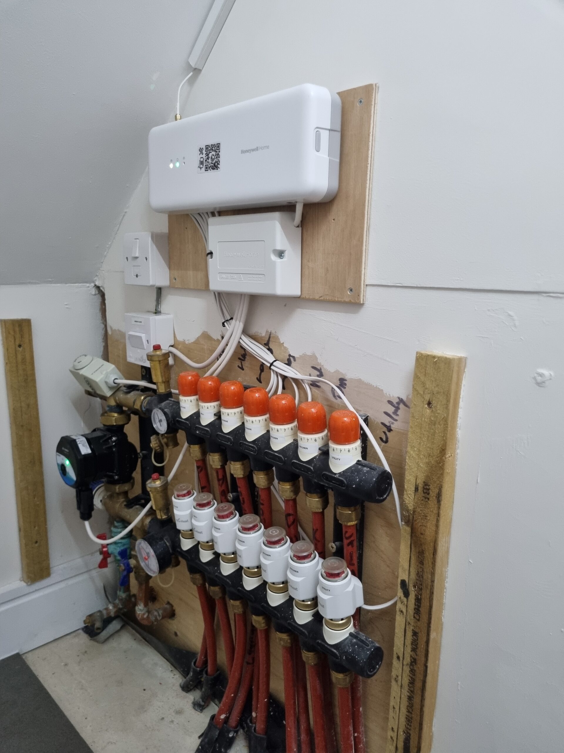 Iain’s underfloor heating wiring centre failed. He already owned a Honeywell/Resideo Evohome system to control the radiator zone and hot water, so he decided to extend the controls to the UFH.